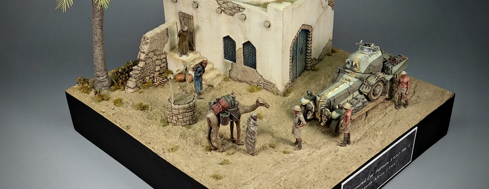 Bau des Dioramas: natürlich stand hier nun eine typisch nordafrikanische Wüstenregion im Focus. Es sei hier angemerkt, dass es nicht unbedingt einfach ist, eine anschauliche Wüstenlandschaft zu kreieren. So besteht hier grundsätzlich die Schwierigkeit, mit wenig viel darstellen zu müssen, da die kargen Wüstenverhältnisse nicht all zu viel Gestaltungsmöglichkeiten zulassen. Letztendlich fiel hier meine Wahl auf das „Arab house“ von Dio72, welches den Mittelpunkt der späteren Szenerie bilden sollte.