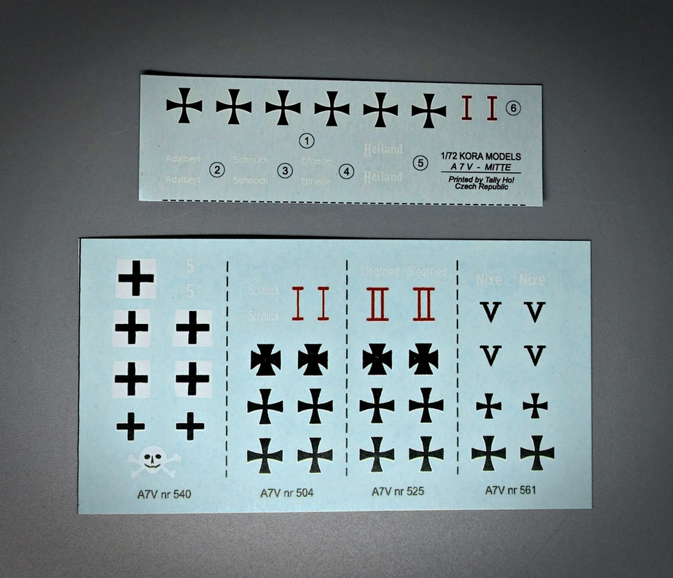 fündig wurde ich hier bei Black Lion Decals. So lassen sich mit dem Bogen 72050 gleich mehrere A7Vs bewerkstelligen (Nr. 540/ Heiland, Nr. 504/ Schnuck, Nr. 525/ Siegfried sowie Nr. 561/ Nixe). Zwar passten sich die Decals hervorragend der Struktur des Modells an und hinterließen dabei keinen Trägerfilm, doch waren die Decals auch so dünn, dass diese bei der Aufbringung schnell den Hang zum Zerreißen hatten und mir deswegen auch eine Menge Nerven kosteten. Lange überlegte ich, ob ich Balkenkreuze im Dachbereich aufbringe, entschied mich dann aber dagegen. So zeigen nur Illustrationszeichnungen diese Kreuze auf. Schaut man sich aber Originalbilder an (gerade von „Schnuck“ bei der Begutachtung durch neuseeländische Truppen) sind diese Kreuze nicht sichtbar. Das mag vielleicht an der ausgeprägten Verschmutzung im Dachbereich gelegen haben, doch hätten diese Kreuze aus meiner Sicht zu dieser Zeit überhaupt keinen Sinn gemacht. So verfügten die Alliierten zu diesen Zeitpunkt an der Westfront über die absolute Luftherrschaft. So hatte gerade bei den deutschen Truppen die Tarnung äußerste Priorität. Da hätten solche Kreuze eher kontraproduktiv gewirkt und sämtliches Artilleriefeuer auf sich gelenkt.