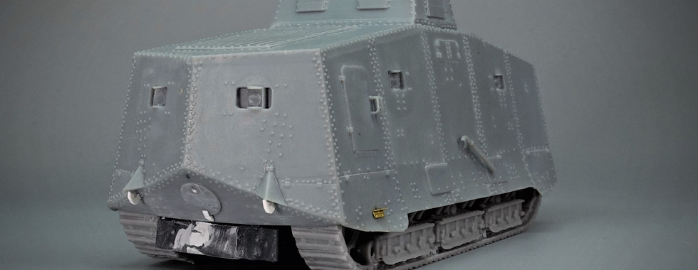 Dabei reagierte die deutsche Führung auf den Einsatz von britischen und französischen Panzern ab dem Jahr 1916. Da das deutsche Reich durch die Seeblockade nur sehr beschränkt über die nötigen Rohstoffe verfügte, zudem der neuen Waffengattung „Panzer“ noch sehr skeptisch gegenüberstand, stand das Hauptaugenmerk auf die bewährte U-boot-Waffe. Das hatte zur Folge, dass eben bis Kriegsende gerade mal 20 Fahrzeuge gefertigt wurden, bei denen man zudem viele Kompromisse bei der Fertigung eingehen musste. So verfügte man kaum über Panzerstahl. Dementsprechend musste die Panzerung aus herkömmlichen Baustahl dicker ausfallen. Die Folge war eine 30mm dicke Panzerung im Front-, sowie 15mm im Seiten- und Heckbereich. Dabei kam der A7V auf ein stattliches Gewicht von knapp 30t. Obwohl der A7V von außen einen sehr geräumigen Eindruck machte, waren die Verhältnisse im Inneren doch mehr als beengt. Die 18-22köpfige Besatzung hatte mit Temperaturen von bis zu 60 Grad Celsius und schlechten Luft- und Sichtverhältnissen zu kämpfen. Trotz seiner beschränkten Fahreigenschaften im unebenen Gelände bewährte sich der A7V im Kampf und nicht wenige Historiker sind sich einig, dass dieser seinen britischen Gegenüber im Form des Mark IV überlegen war. Natürlich hatten die wenigen A7Vs keinerlei Auswirkungen auf die Auswirkungen des Krieges. So standen auf dem Höhepunkt den 20 A7Vs und knapp über 100 erbeuteten Panzern aus britischer Produktion über 6000 alliierte Panzerfahrzeuge gegenüber.