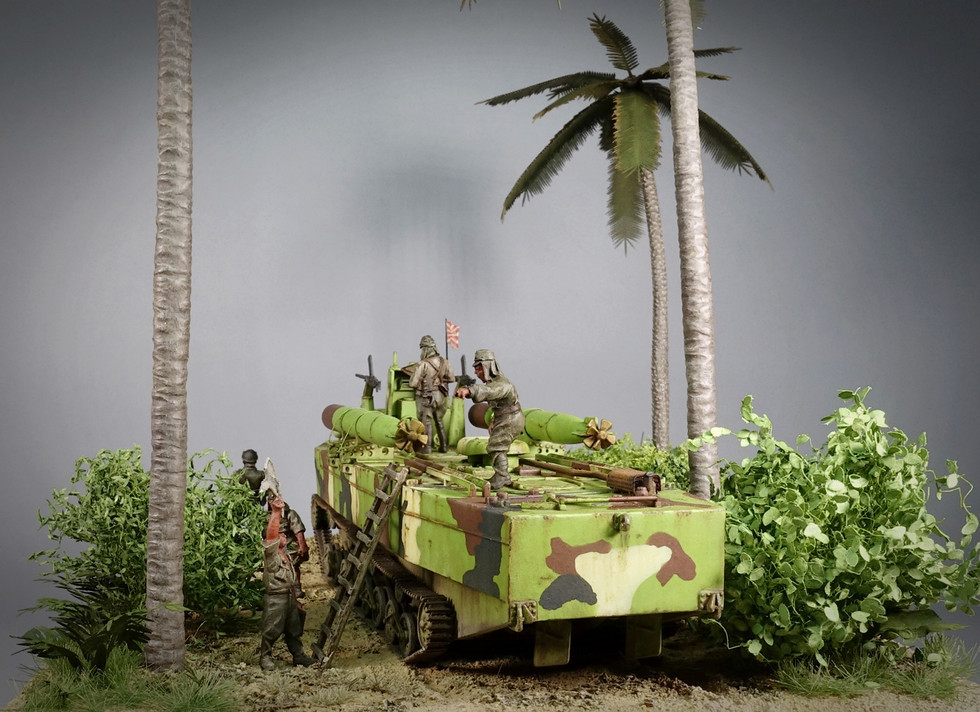 Wie auch schon vorher schon erwähnt, zeige ich hier nur eine fiktive Szene, in der das „Ka-tsu“ im sicheren Versteck auf einen Einsatz vorbereitet wird. Während man noch mit diversen Abwicklungen am Fahrzeug beschäftigt sind, geht der Blick eines Besatzungsmitglied schon in die Ferne, konzentriert, vielleicht auch melancholisch, da es sich vielleicht auch um einen Selbstopferungs-Angriff auf die feindliche Landungsflotte handelt, die an einen anderen Abschnitt der Insel dabei ist, ihre Truppen an Land zu bringen...